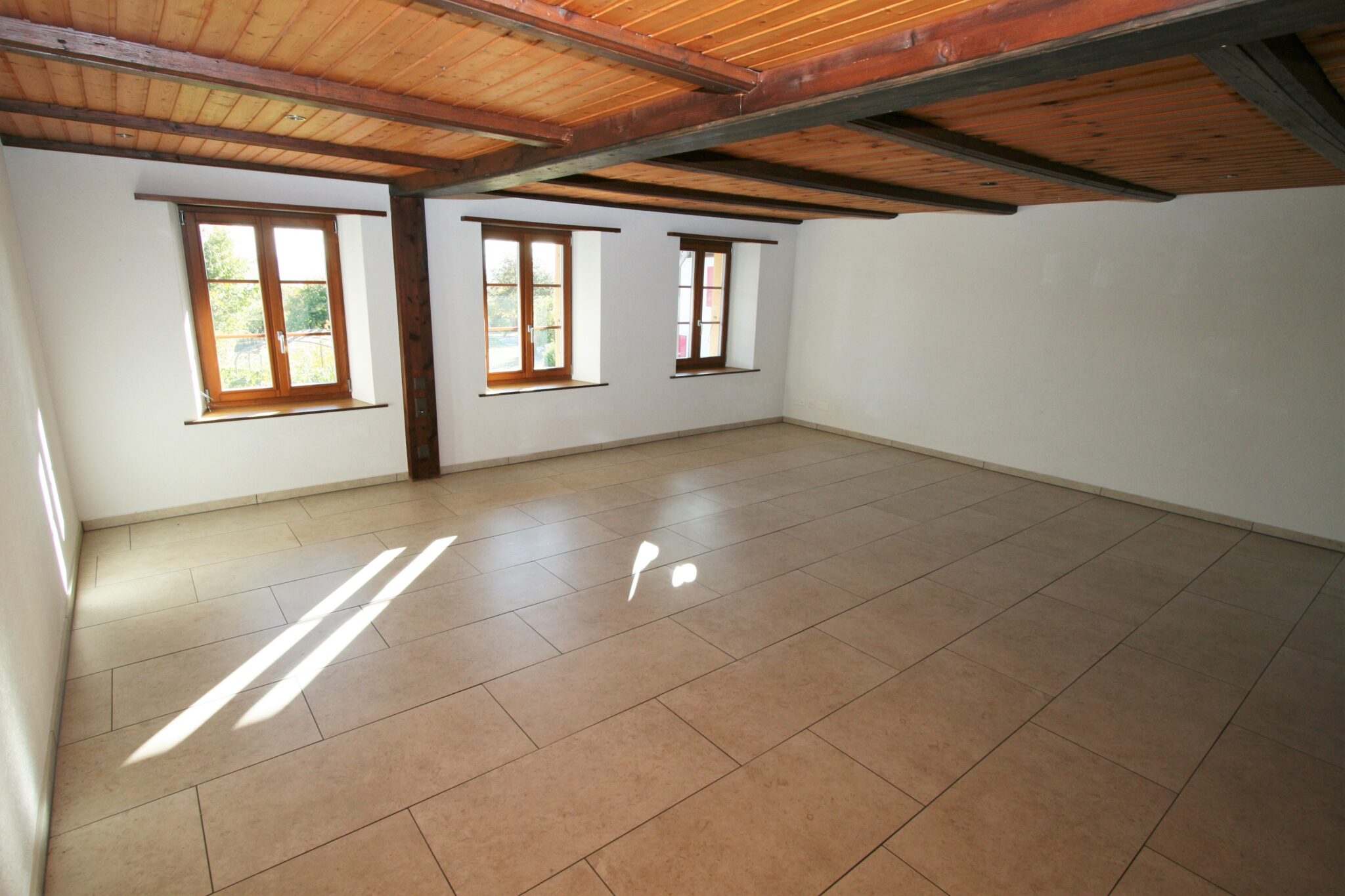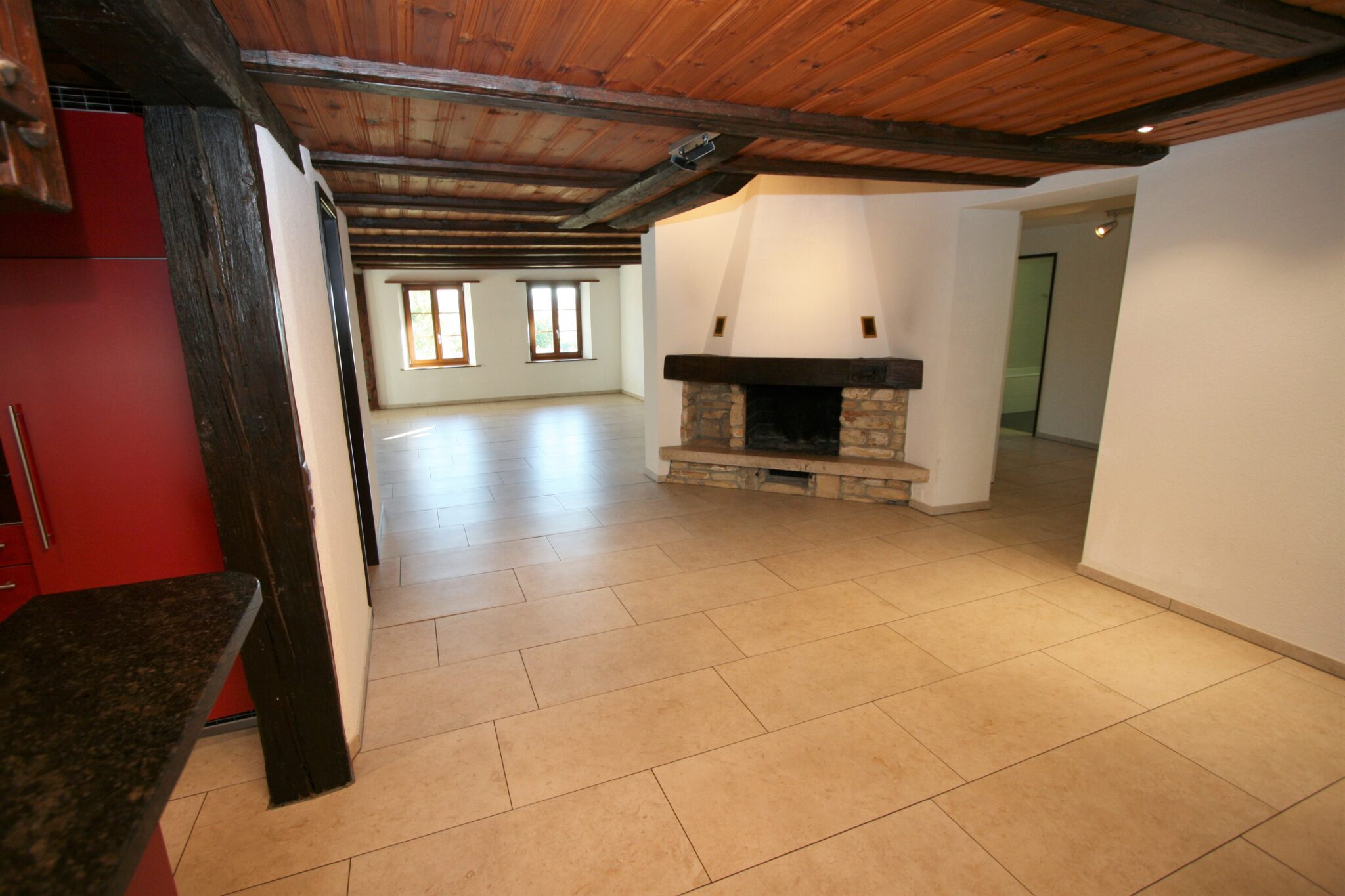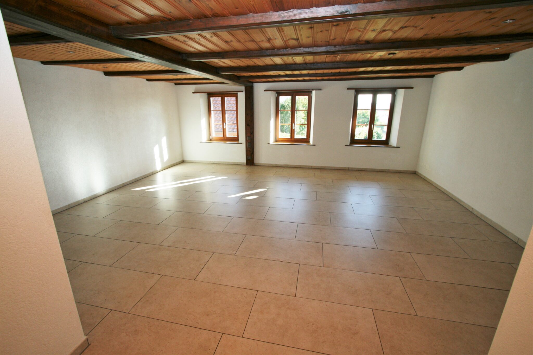 Alle Zimmer sowie die Küche und das Badezimmer sind mit einem pflegeleichten Plattenboden ausgestattet. Der helle Boden steht in schönem Kontrast zu den Holzbalken an der Decke im Wohnbereich.