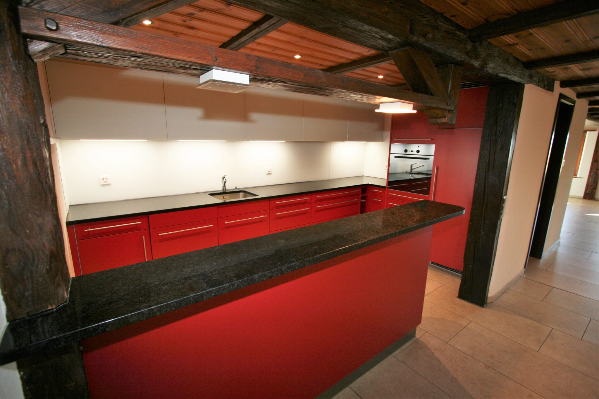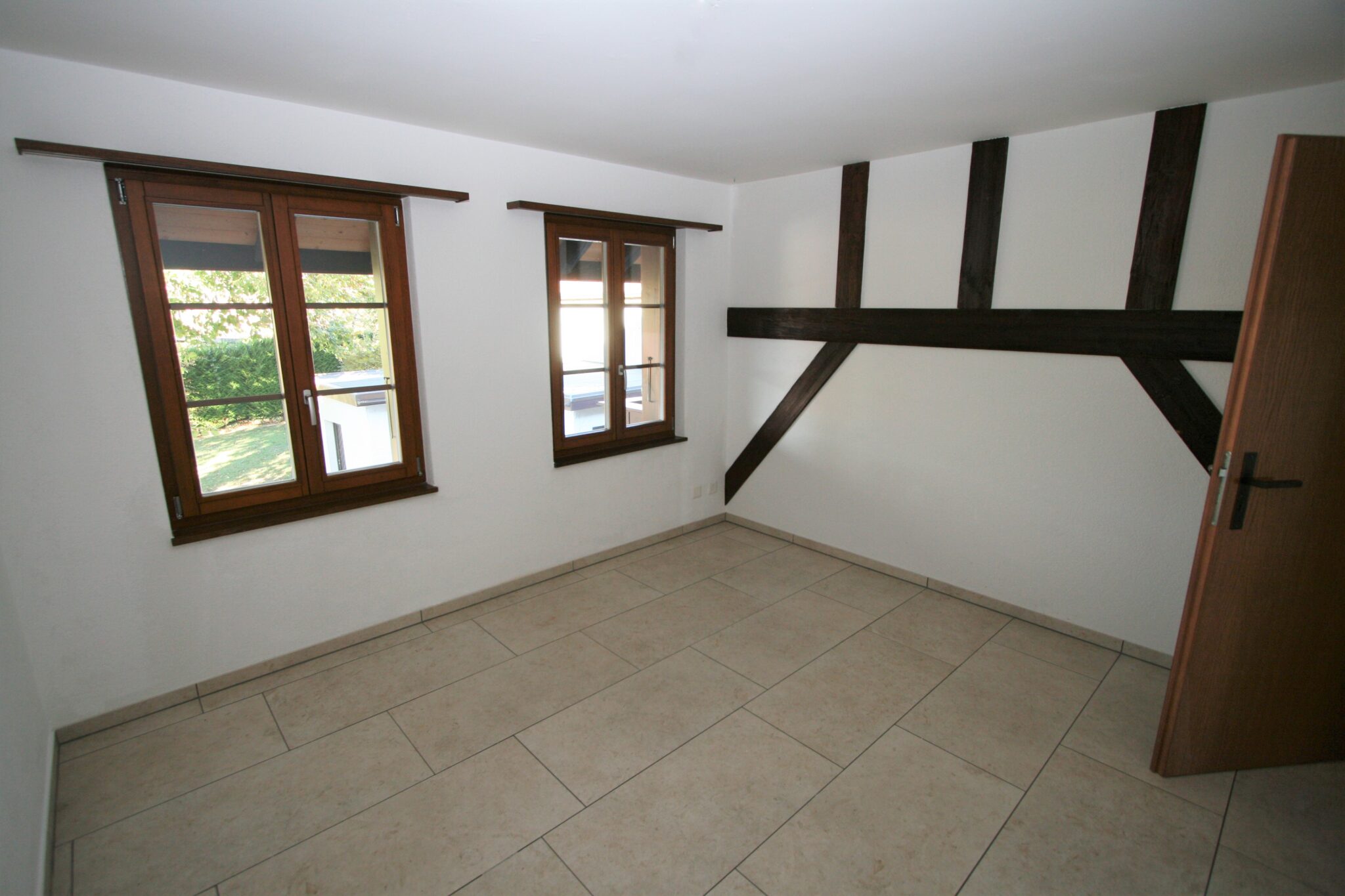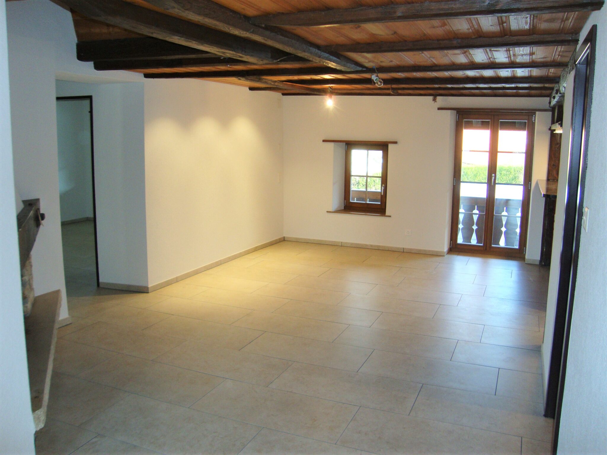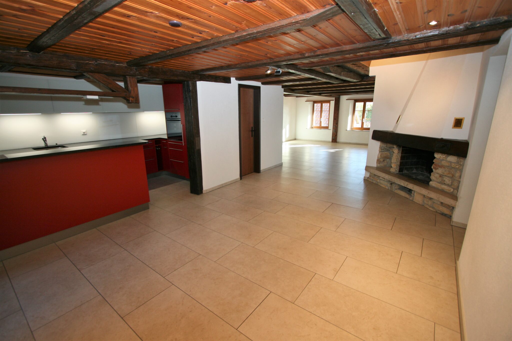 Alle Zimmer sowie die Küche und das Badezimmer sind mit einem pflegeleichten Plattenboden ausgestattet. Der helle Boden steht in schönem Kontrast zu den Holzbalken an der Decke im Wohnbereich.