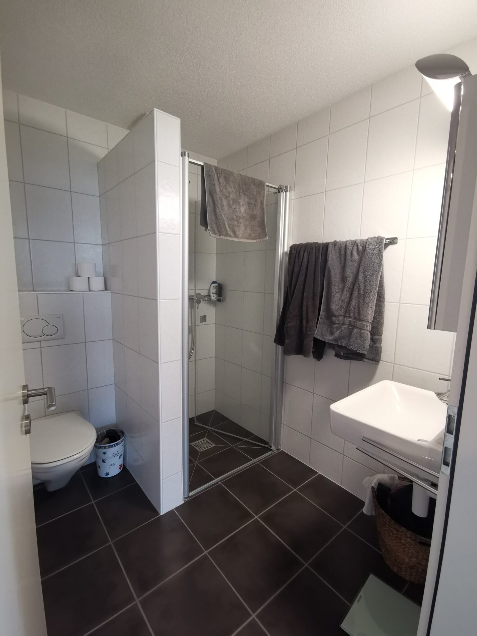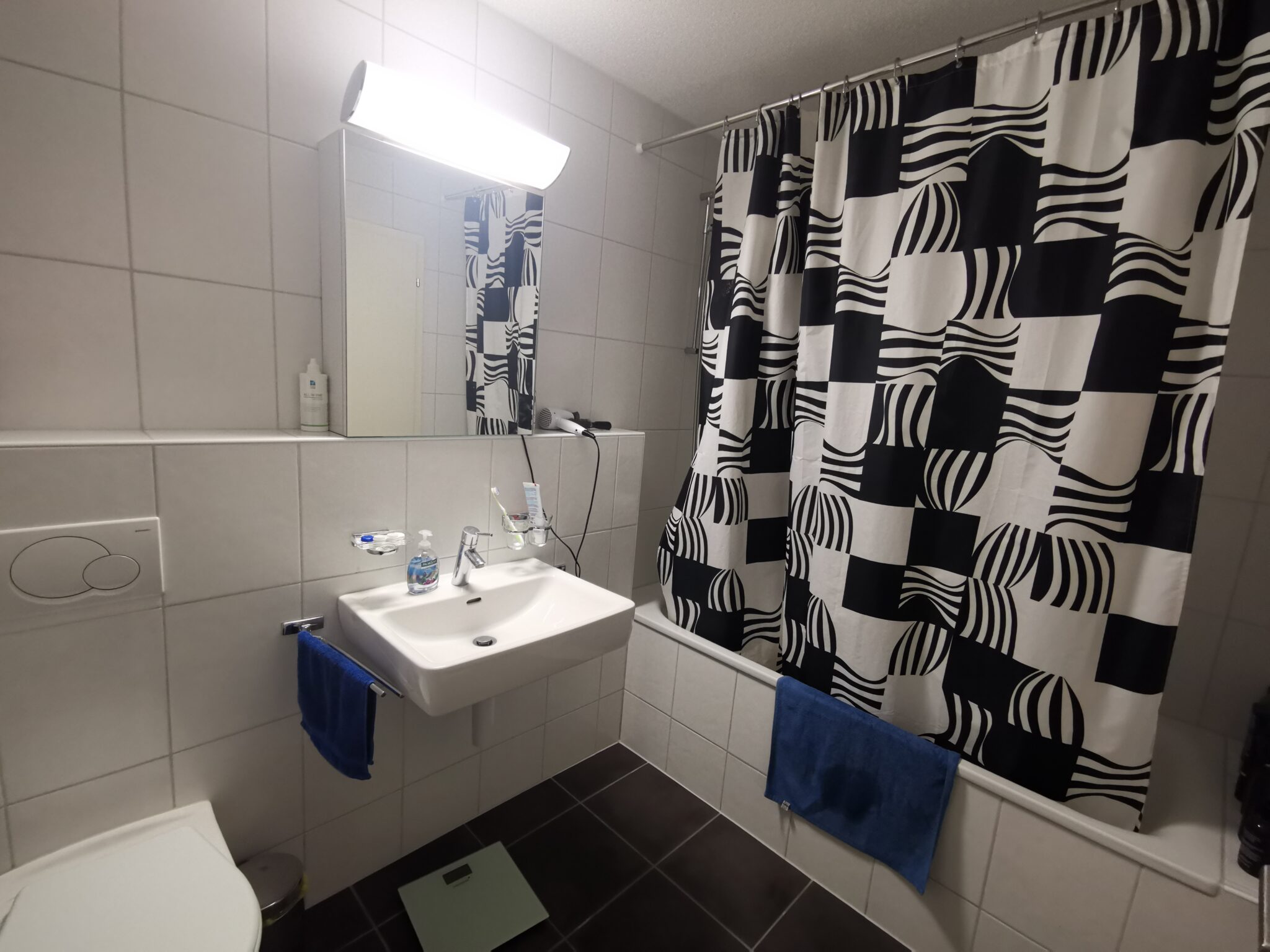Das Badezimmer mit Badewanne sowie das separate WC mit Dusche verfügt über einen pflegeleichten Plattenboden.