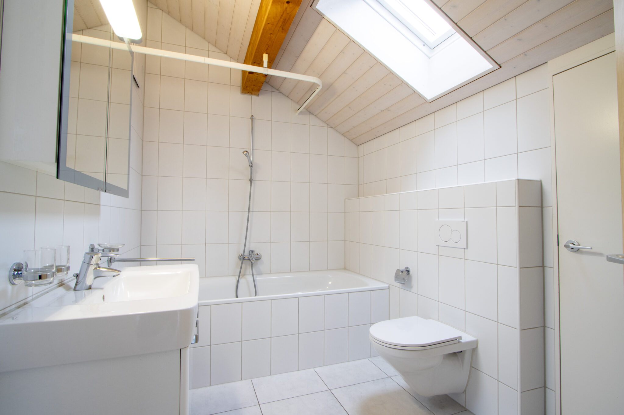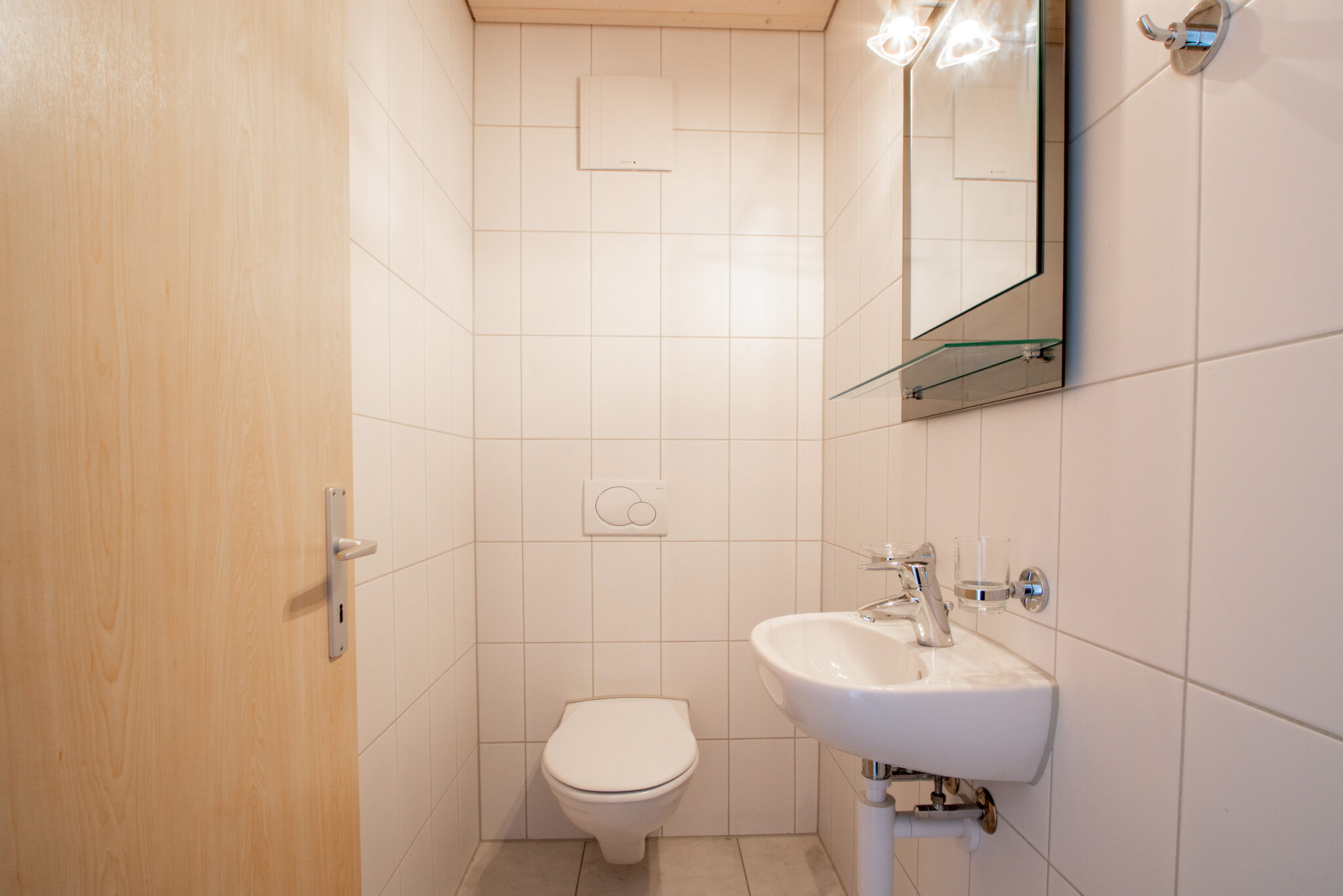 Es stehen Ihnen ein Badezimmer mit Badewanne und integriertem Abstellraum sowie ein separates Gäste-WC zur Verfügung.